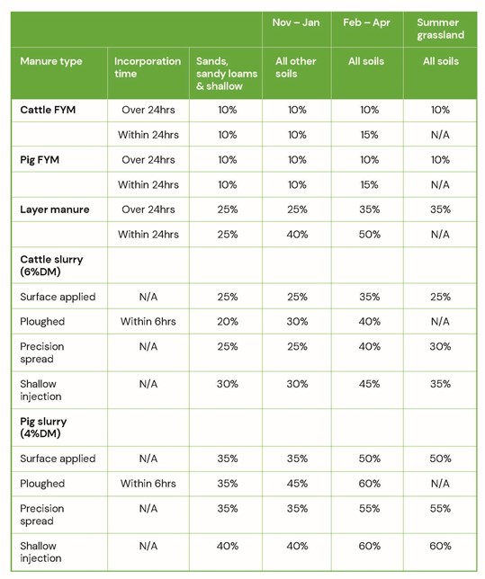 To make the best use of the readily available nitrogen within farmyard manure (FYM) and slurry, storage and timing of application are important. Rapid incorporation into soils minimising the volatilisation of nitrogen as ammonia gas into the atmosphere. The table below highlights the differences in available nitrogen depending on timing of application and speed of incorporation and can be used to assist you with fertiliser planning and nutrient budgeting.