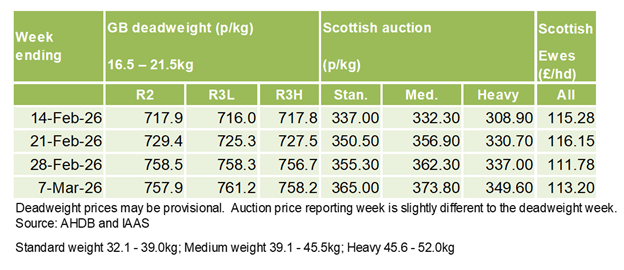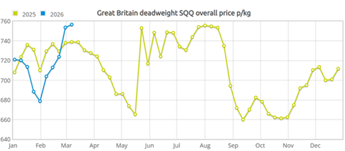 This year, deadweight prices initially declined, dropping to a low of 678.7 p/kg (w/c 31 Jan) which unusually coincided with a drop in supply. Despite this, prices remained strong compared to 2025. February has recorded recovery with prices increasing again just marginally behind 2025 prices throughout the month. This increase in demand coincided with the start of Ramadan on 17 February. Religious festivals are undoubtedly a key driver for our sheep market with 30% of UK sheep meat consumed going to 6.5% of the population in the UK (AHDB, 2024). This demand has led to deadweight prices peaking this year above the 2025 high at 765.5ppkg (w/c 7 March).