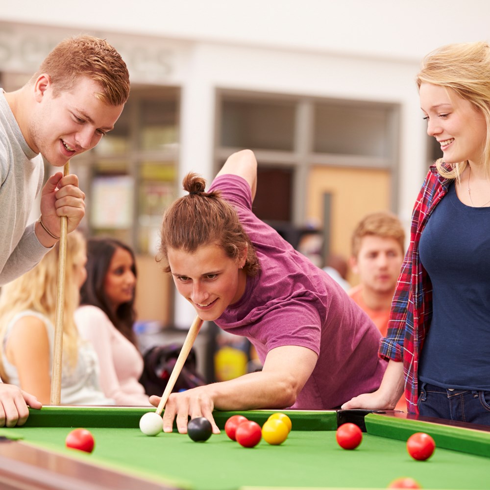 We have a bar on campus which opens in the evenings for all students. It also has a pool table with a student pool club, and juke box.